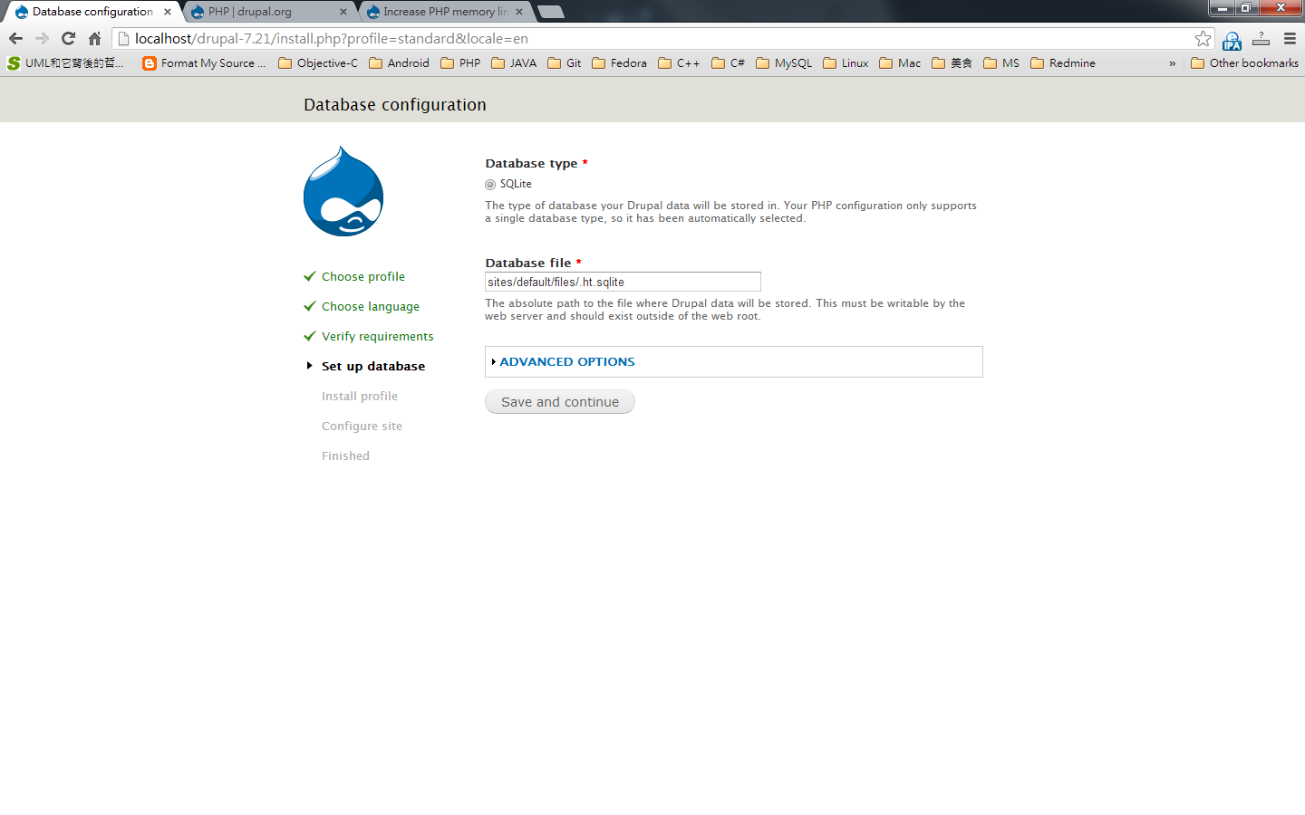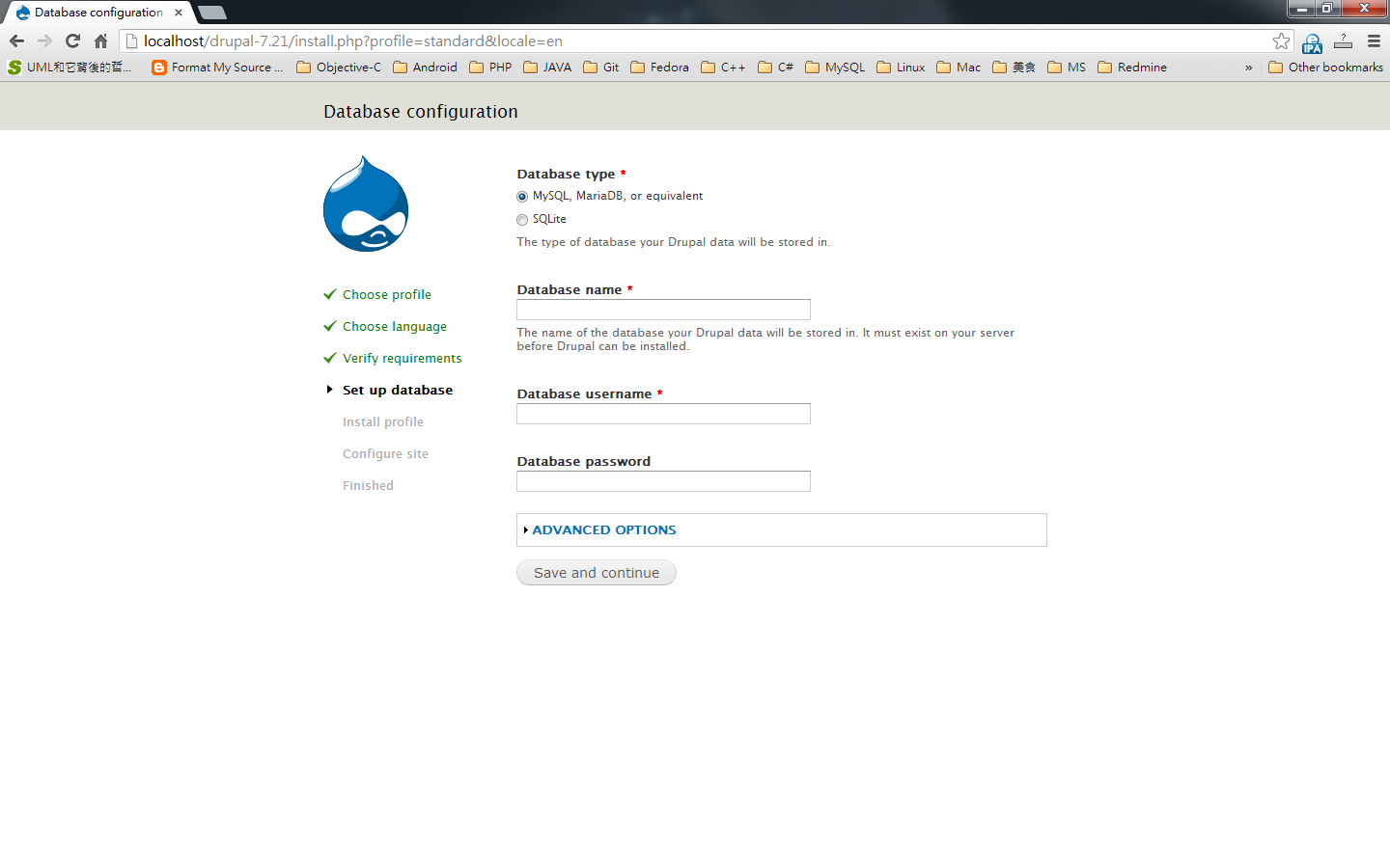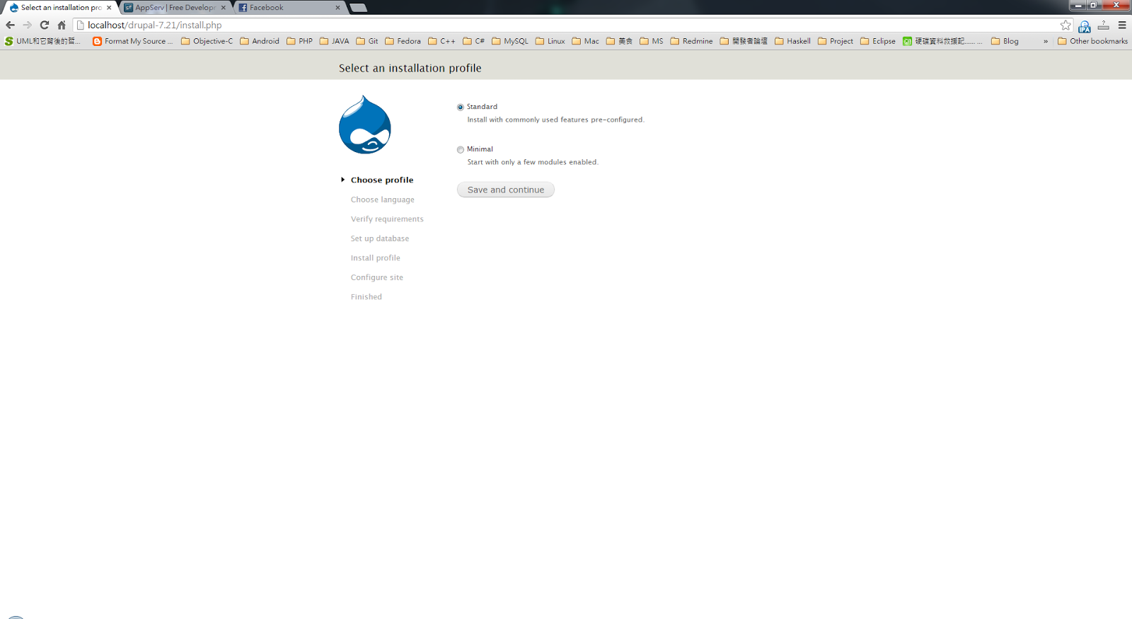 輸入localhost/drupal-7.21/install.php進入安裝畫面