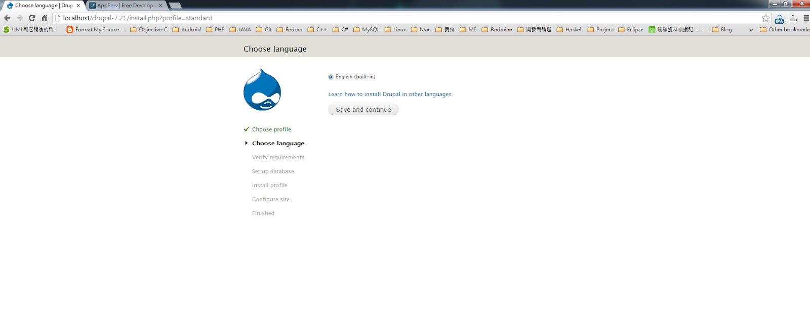 我挑選AppServ 2.5.10原因是因為我安裝的是Drupal 7.21,Drupal 7有要求要使用 PHP 5.2.5 or higher (5.3 recommended).,Database也要求要是MySQL 5.0.15 or higher with PDO, PostgreSQL 8.3 or higher with PDO, SQLite 3.3.7 or higher